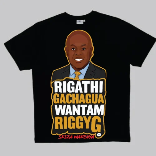 A high-quality printed T-shirt featuring a detailed artistic illustration of Rigathi Gachagua. Soft, durable fabric and long-lasting print—perfect for fans, collectors, or gift items.